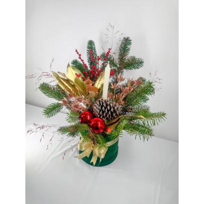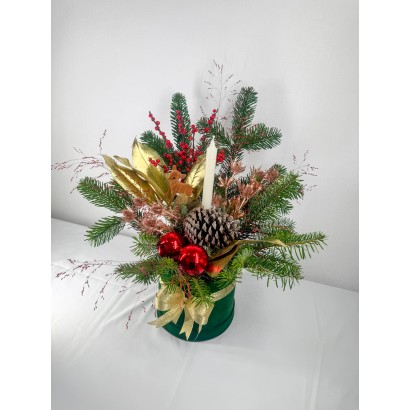 Una creación única que captura la magia de la Navidad. Esta sombrerera combina abetos, pinos y follajes invernales cuidadosamente seleccionados para formar un pequeño paisaje boscoso lleno de encanto. Cada elemento está dispuesto de forma armoniosa, realzado con detalles decorativos festivos como frutos rojos, piñas naturales, toques dorados y pequeñas luces cálidas que aportan un brillo acogedor.