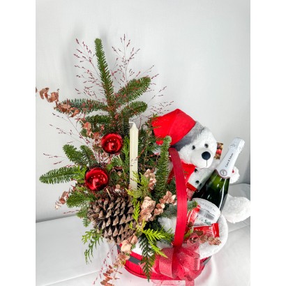 Celebra la magia de la Navidad con este encantador centro navideño presentado en una elegante cesta de mimbre, perfecto para regalar o para decorar cualquier rincón especial del hogar. Su composición combina elementos naturales, detalles festivos y un adorable peluche navideño que aporta calidez y ternura a la escena.