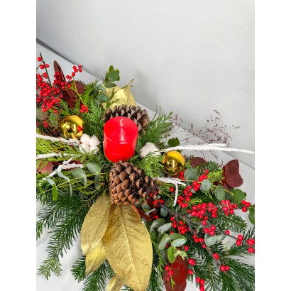 La composición combina eucalipto, algodón natural, ramas de ilex rojo y pinzapo, creando un equilibrio perfecto entre texturas, aromas y colores típicos de la Navidad. En el corazón del diseño se alza una vela decorativa, que aporta un toque de luz suave y acogedora, ideal para mesas, recibidores o espacios especiales del hogar.